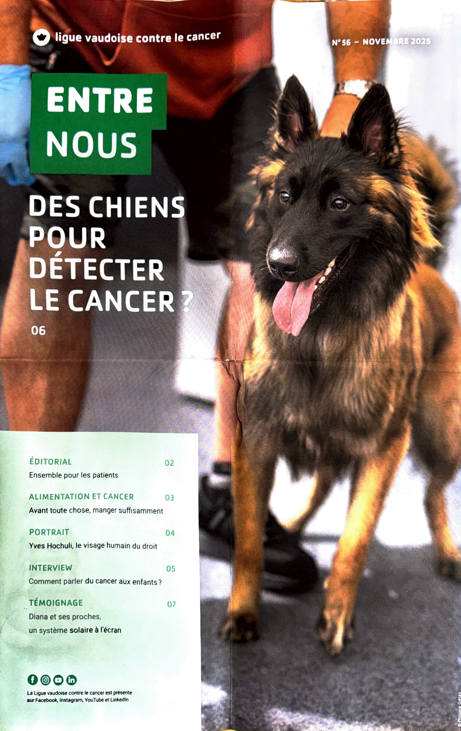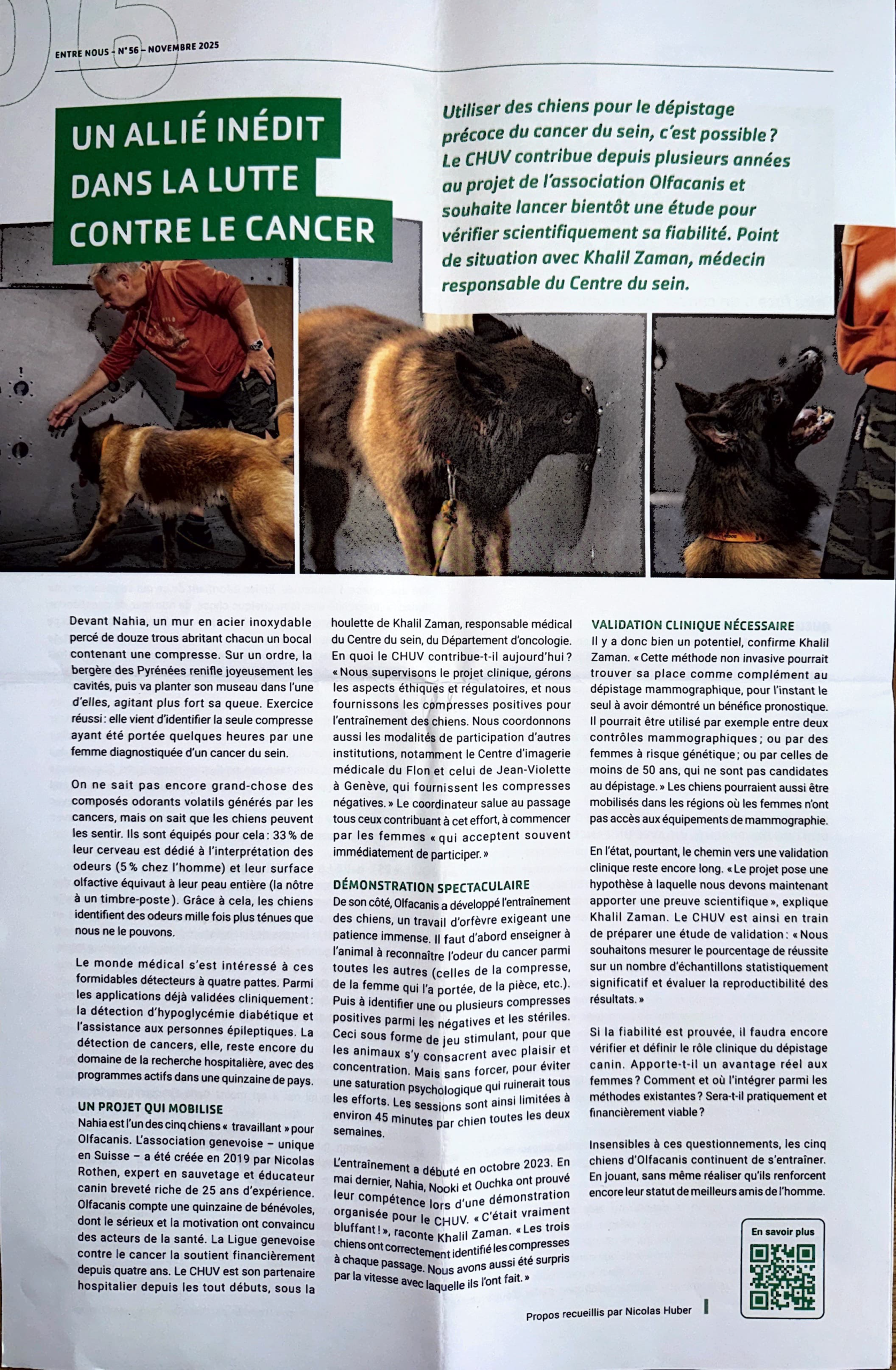 Nahia est l’un des cinq chiens « travaillant » pour Olfacanis. L’association genevoise – unique en Suisse – a été créée en 2019 par Nicolas Rothen, expert en sauvetage et éducateur canin breveté riche de 25 ans d’expérience. Olfacanis compte une quinzaine de bénévoles, dont le sérieux et la motivation ont convaincu des acteurs de la santé. La Ligue genevoise contre le cancer la soutient financièrement depuis quatre ans. Le CHUV est son partenaire hospitalier depuis les tout débuts, sous la houlette de Khalil Zaman, responsable médical du Centre du sein, du Département d’oncologie. En quoi le CHUV contribue-t-il aujourd’hui ? « Nous supervisons le projet clinique, gérons les aspects éthiques et régulatoires, et nous fournissons les compresses positives pour l’entraînement des chiens. Nous coordonnons aussi les modalités de participation d’autres institutions, notamment le Centre d’imagerie médicale du Flon et celui de Jean-Violette à Genève, qui fournissent les compresses négatives. » Le coordinateur salue au passage tous ceux contribuant à cet effort, à commencer par les femmes « qui acceptent souvent immédiatement de participer. »